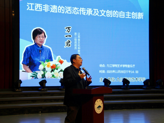 11月26日下午,江西省文化和旅游厅原二级巡视员万一君在艺术学院开展“江西非遗的活态传承及文创的自主创新——以九江为例”专题讲座。讲座由艺术学院院长张甘霖主持,学院全体教师及部分专业学生参加。