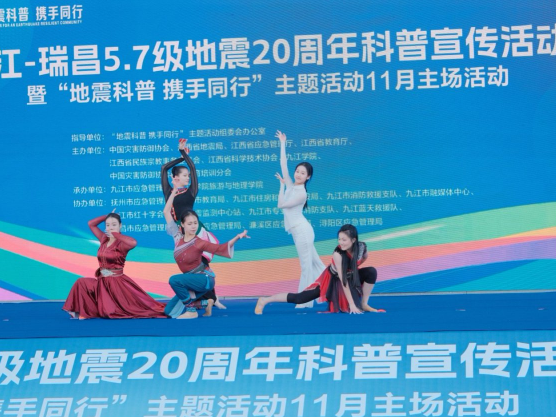 活动的氛围在后续的现场宣教及互动体验环节中被进一步推向高潮。艺术学院的同学们先后奉献了民间舞蹈《丽影风姿》歌舞表演《是你一直想着我》将多民族民间舞蹈元素巧妙串联,同学们舞姿翩跹,韵味十足,展现了中华传统文化的魅力与生机,为严肃的科普活动注入了浓郁的艺术气息。紧随其后的歌舞表演《是你一直想着我》我院青年优秀教师戴利东和九江青年歌舞团的演员们则通过歌声完美融合,深情讴歌了在困难面前无私伸出援手、始终心系人民安全的守护者形象,节目情感真挚,场面温馨感人,引发了观众强烈的共鸣。