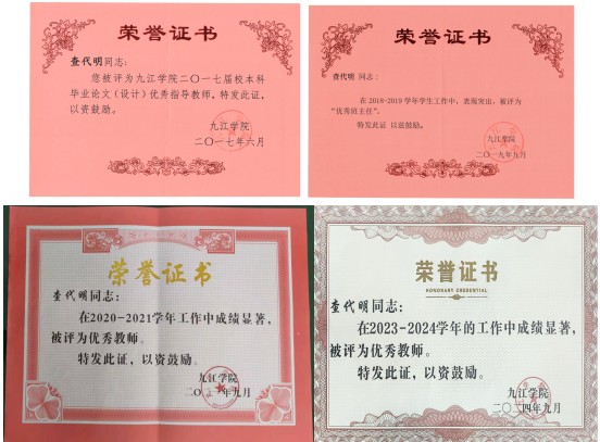 优秀毕业论文指导教师、优秀班主任、优秀教师等荣誉。