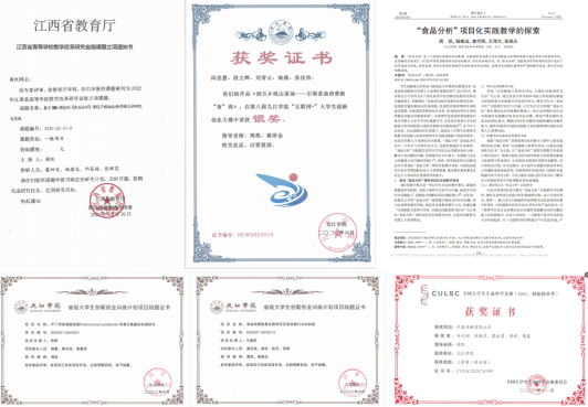 经常在周末和寒暑假带学生深入行业企业调研,成立了茶油精深加工小组、茶油掺伪鉴定小组、发酵食品安全小组三个学生科研团队,基于企业研究瓶颈设立课题,培养学生参与到学科竞赛及创新创业项目中。目前获得了低油腻感的直饮茶油、强抗炎作用的超临界萃取茶油、基于特征成分与特征性质的茶油掺伪检测方法、低有害胺“氨”类代谢物的发酵酒等成果,指导学生第一作者发表SCI论文1篇,CSCD论文2篇,开发产品2款;以第一指导老师指导学生立项并结题省级创新创业课题3项,校级1项,获得全国大学生生命科学竞赛三等奖3项,省级三等奖1项,“互联网+”校级奖励若干项。